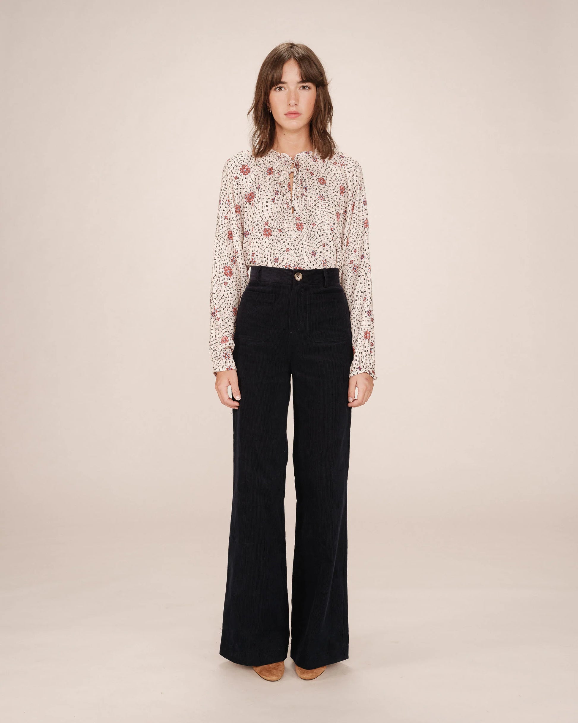 La blouse à manches longues SCARLETT est sublimée par un imprimé floral seventies qui dessine une silhouette bohème. La blouse comporte des éléments tels qu'une encolure en V avec deux liens à nouer sur le devant et des manches longues à poignets élastiqués, qui en font une pièce sophistiquée et travaillée. La blouse à motifs SCARLETT présente une coupe droite qui convient aux courbes de chaque femme.