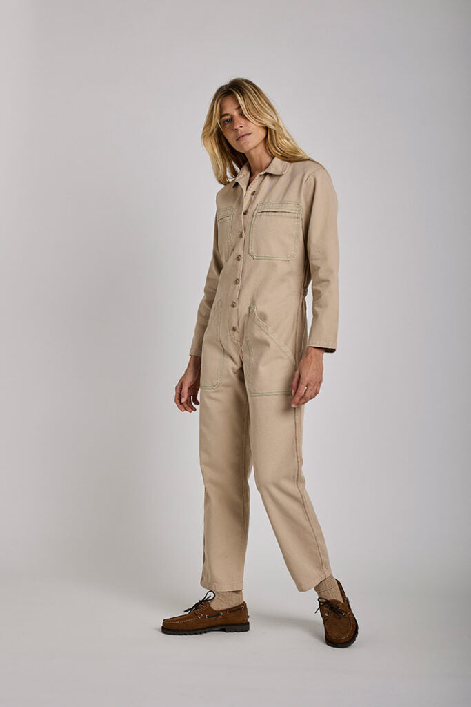 Couleur beige. Surpiqûres multi. Poches plaquées au niveau de la poitrine et des hanches. Poche arrière droite.