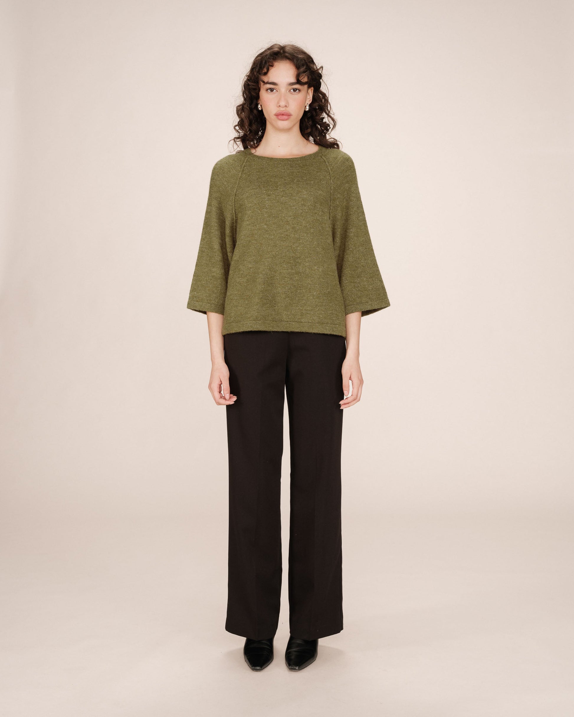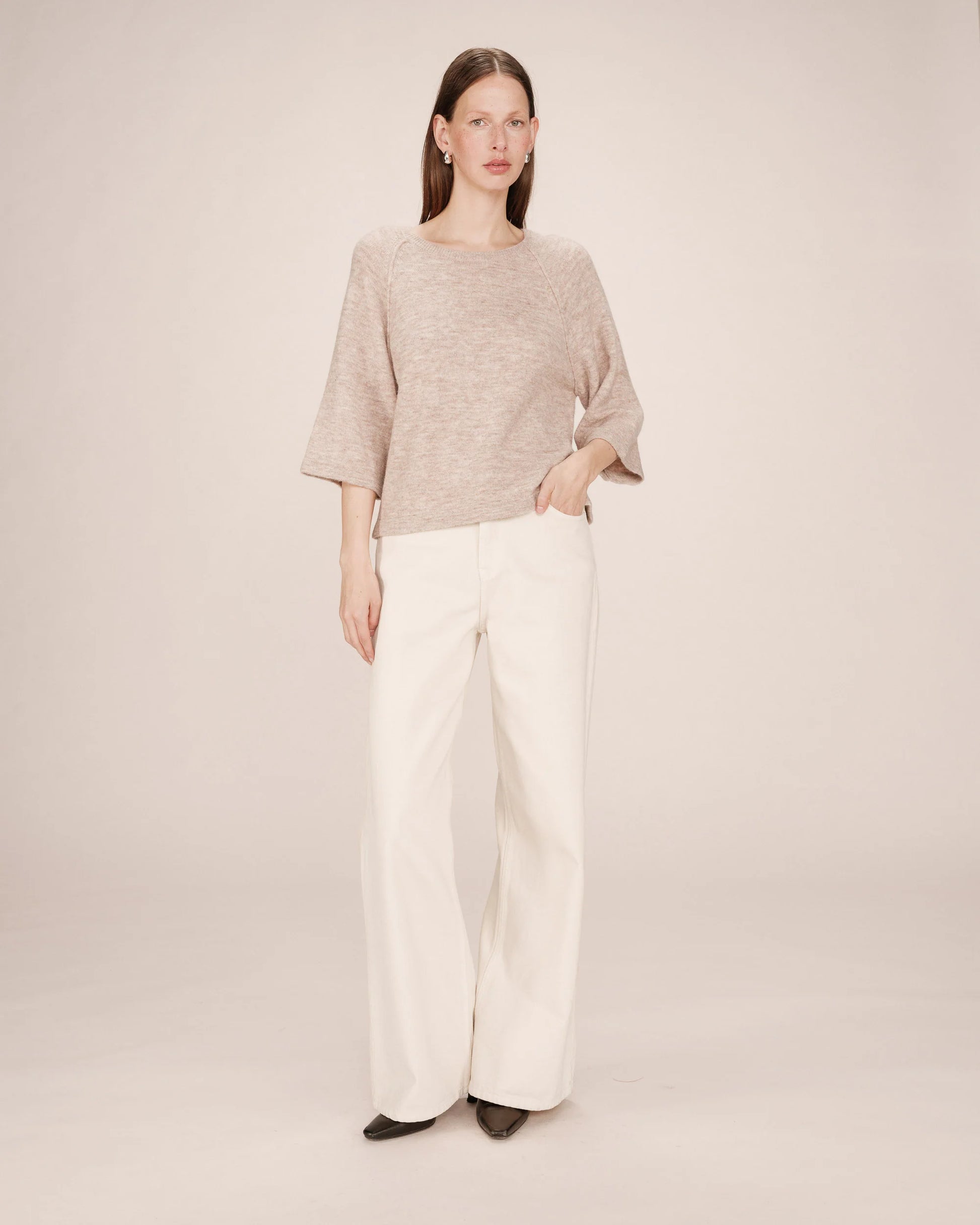 Confectionné dans un fil contenant de la laine et du mohair, le pull large SAM est une pièce chaude et confortable. La coupe large et carrée a été pensée pour intégrer le vestiaire du quotidien. Avec ses détails tels que l'encolure ronde et les manches 3/4, le pull en laine SAM ajoute à la collection une pièce féminine au design élégant et casual.