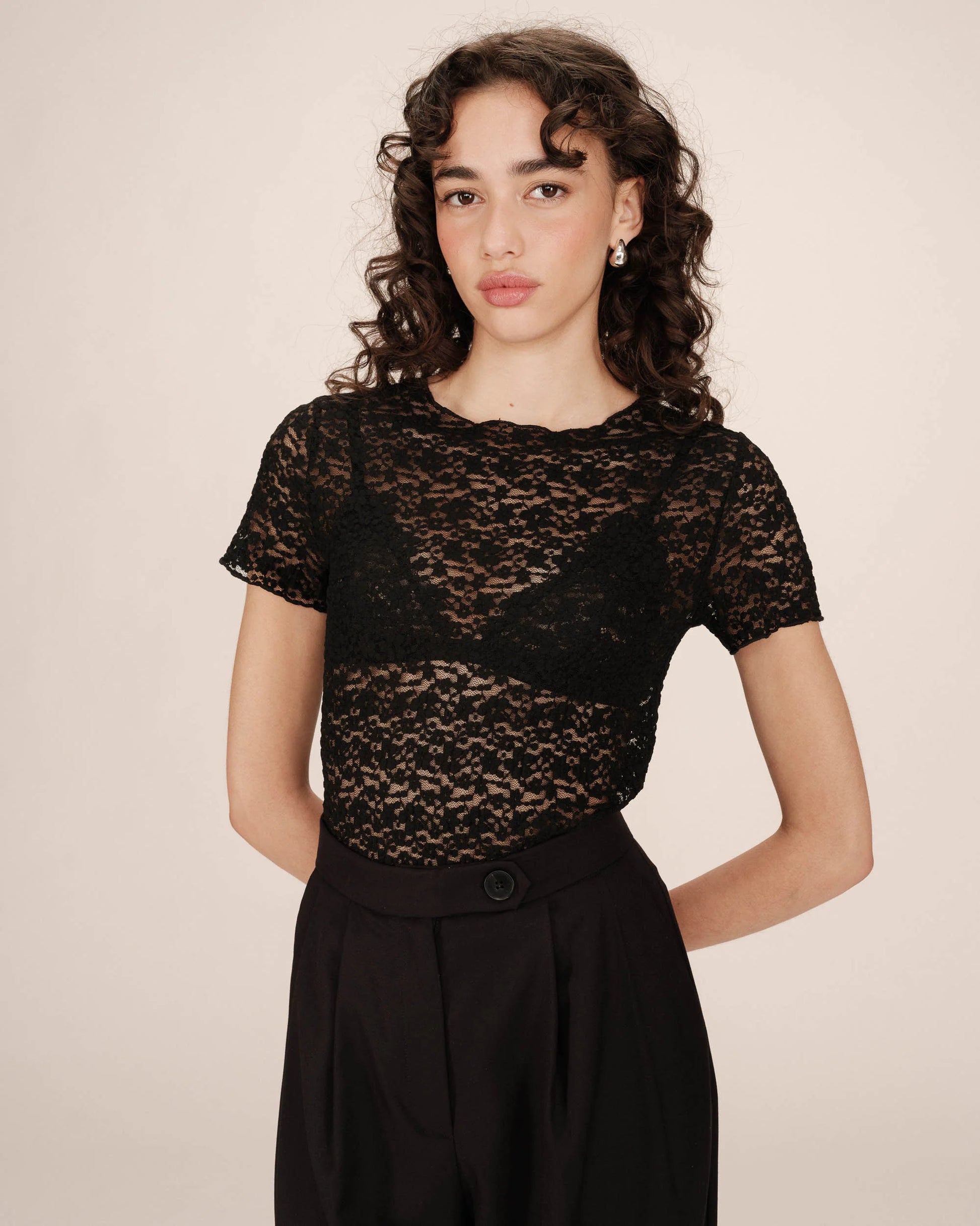 Le t-shirt à manches courtes SWIFT est une pièce à l'allure sensuelle et moderne. Confectionné dans un tissu en dentelle stretch, le modèle épouse les courbes pour une silhouette féminine et assumée. Les finitions ondulées à l'encolure, aux poignets et à la taille en font un modèle travaillé et élégant. L'encolure ronde et la coupe ajustée du t-shirt en dentelle SWIFT jouent entre élégance et audace.