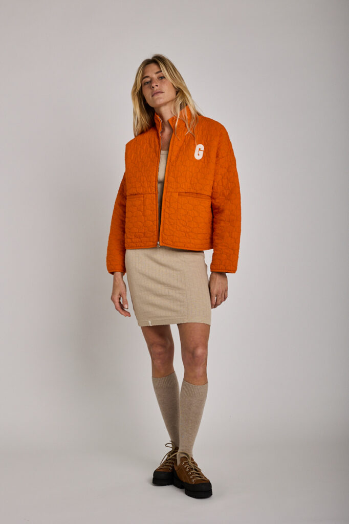 Couleur orange ou beige. Broderie vanille. Deux poches plaquées latérales. Fermeture centrale Zip YKK.